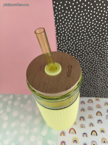 Includes 1 (one) glass tumbler w/straw & lid, as pictured. Measures approx. 7" tall, not including lid. Nice & clean with no chips, cracks, scratches, or stains.