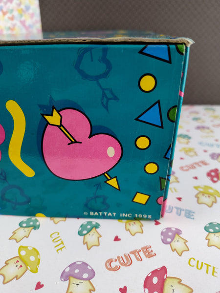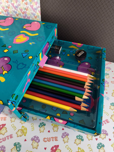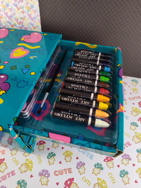 Nice & clean, near complete (missing one pen/pencil in middle drawer. Markers tested to work. In great shape overall, some light wear around edges/corners of box. No stickers or stains. Measures approx. 9" x 9", 4" tall.