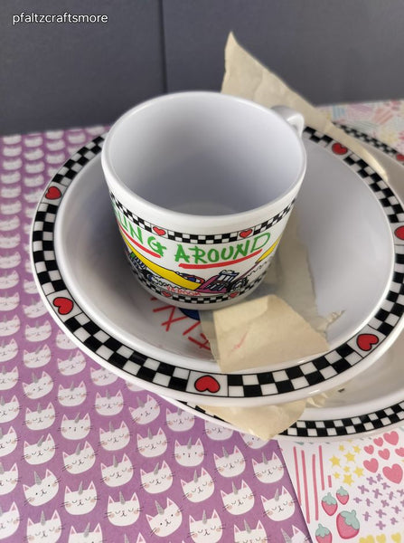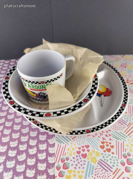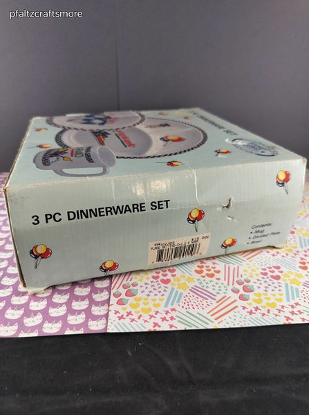 Unused, Open Box. Includes divided plate, bowl, & mug as pictured in original box. Plate measures 8.5" diameter, for scale. No defects. Box shows moderate wear from storage.