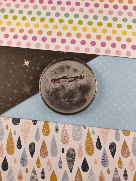 Measures approx. 2.25" in diameter. Pin is in good shape, some light wear on front/back, no stains. No rips or tears to front.