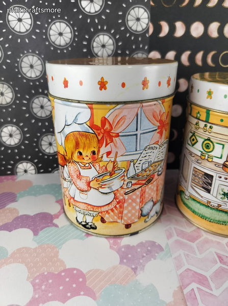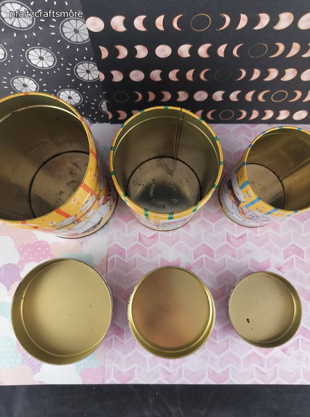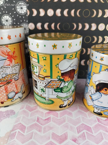Includes 3 (three) canisters, as pictured. Nice & clean with no stains, designs on sides & tops show minimal scuffing. Minimal rusting around rims of lids & bottoms. Largest canister measures approx. 5.5" tall, 4" diameter.