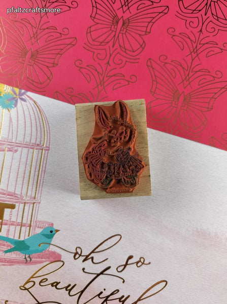 Includes 1 (one) wooden/rubber stamp block, as pictured. Rubber of stamp & underside of wood have some mild staining from light use. Measures approx. 1.5" x 2.25".
