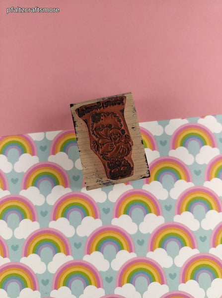 Includes 1 (one) wooden/rubber stamp block, as pictured. Rubber of stamp & underside of wood have some mild staining from light use. Measures approx. 1.5" x 2.25".