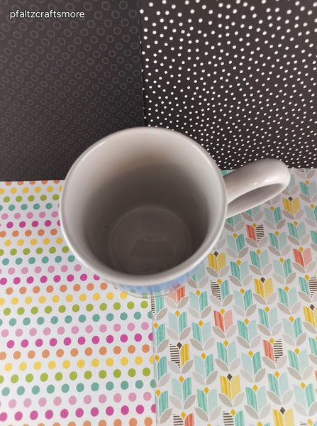 Includes 1 (one) mug, as pictured. Measures approx. 4.25" tall, design shows minimal scratching. No chips or cracks to ceramic itself, no stains.