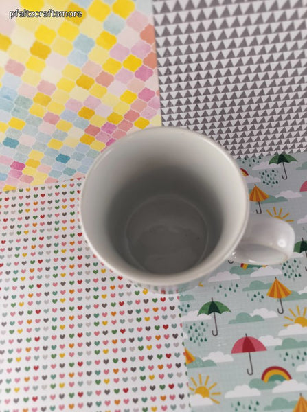 Includes 1 (one) mug, as pictured. Measures approx. 3.75" tall, like new. No chips, cracks, scratches, or stains.