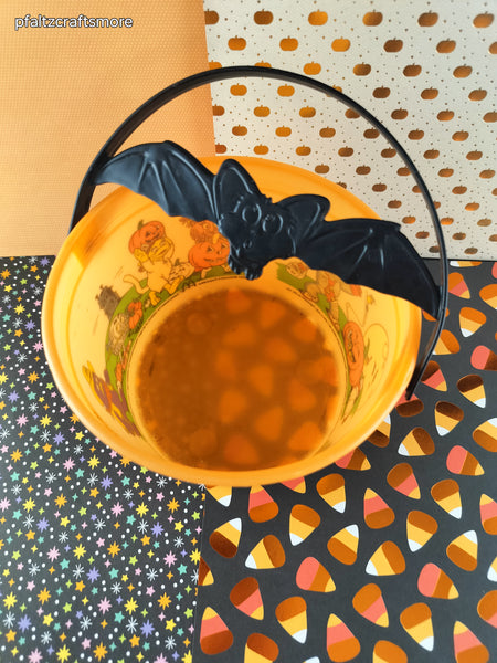 Cute candy pail/bucket has no chips, cracks, or scratches. Inside is clean, underside of bottom has some light staining/dirtying from storage. Pail measures approx. 4.75" tall, not including handle.
