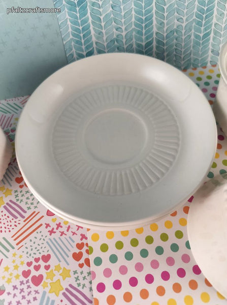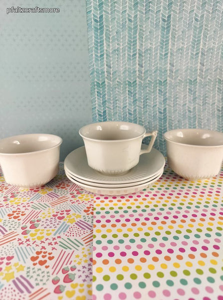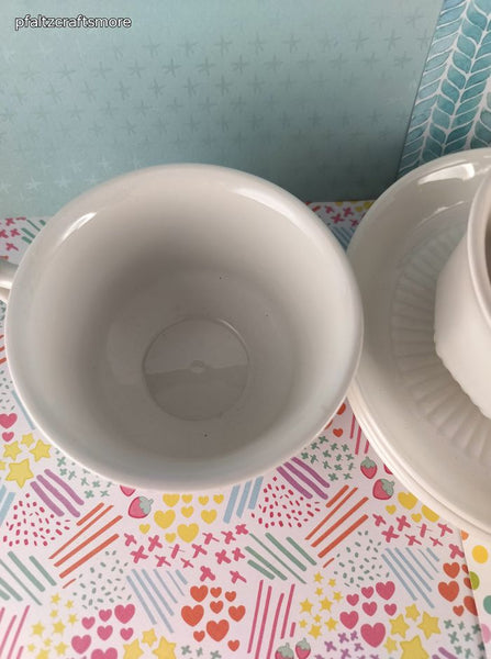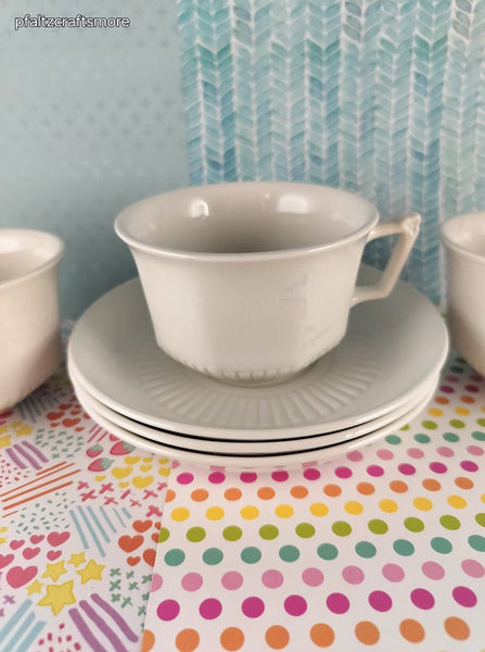 Includes 3 (three) cups + 3 (three) saucers, as pictured. In excellent shape, like new. No signs of wear or use; no stains, no chips or cracks. Each cup measures approx. 3.75" diameter at top.