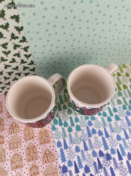 Includes 2 (two) mugs, as pictured. In fair shape with no wear or scratching to design, a few very small chips along edge of one of the mugs. No cracks, no deep scratches, no stains. Each mug measures approx. 3.5" tall.