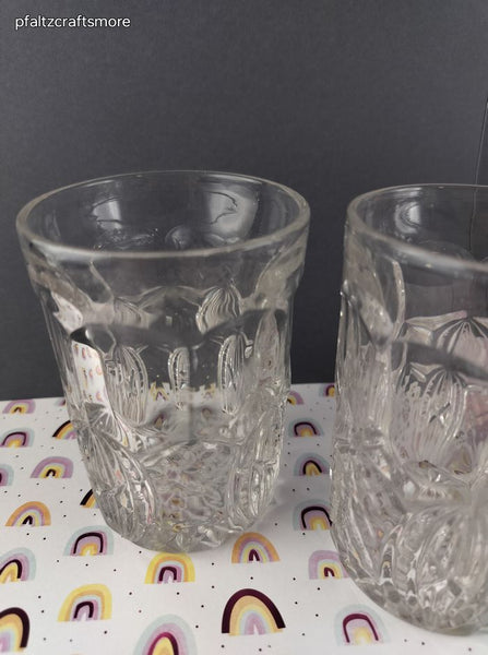 Includes 4 (four) glass tumblers, as pictured. Each measures approx. 4" tall. Glasses are clean with no chips, cracks, scratches, or stains. One of the 4 tumblers has a very small manufacturing defect on rim, hard to picture but can be somewhat seen in second to last photo. Glass is smooth to touch.