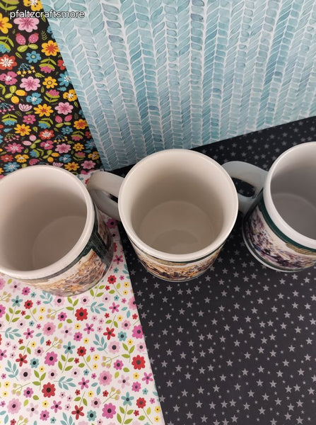 Includes 3 (three) mugs, as pictured. In excellent shape with no wear or scratching to design, no chips or cracks. Each mug measures approx. 3.75" tall.