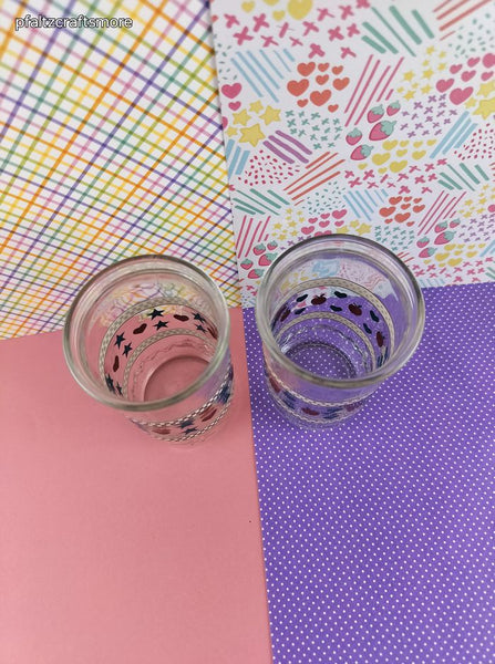 Includes 2 (two) tumblers, as pictured. Each measures approx. 3.5" tall. Glass in perfect shape with no scratching, no cracks, no stains. Design in perfect shape. Like new.