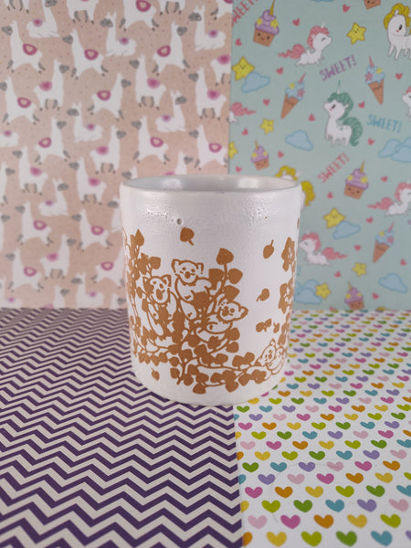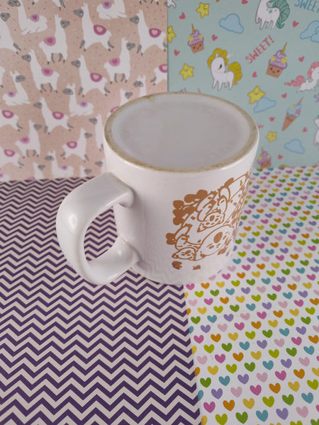Like New. Mug is nice & clean measuring approx. 3.75" tall, standard size. Design is clean, mug has some "bubbling" and a few stray brown markings from manufacturing which are sealed under the surface during manufacture. No chips or cracks, no scratching.