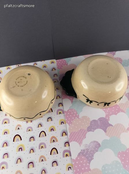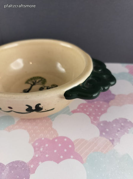 Includes 2 (two) bowls, as pictured. Each measures approx. 5" diameter, not including the handle. Nice & clean, only the most minute of light silverware scuffing (surface only) can be seen in direct light. Smooth to touch. Design in perfect shape. No chips or cracks, no stains.