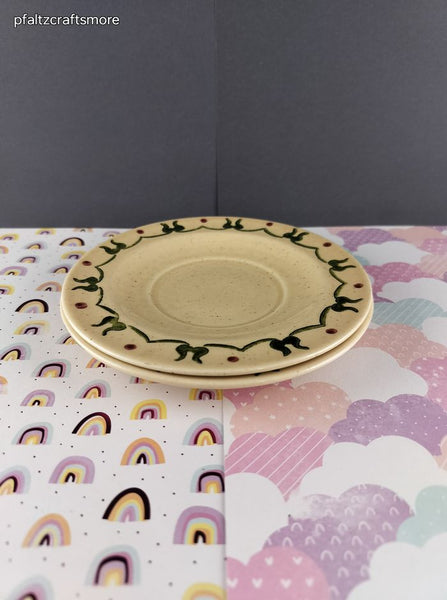 Includes 1 (one) saucer plate, as pictured. Measures approx. 6" diameter. Nice & clean, only the most minute of light silverware scuffing (surface only) can be seen in direct light. Smooth to touch. Design in perfect shape. No chips or cracks, no stains.