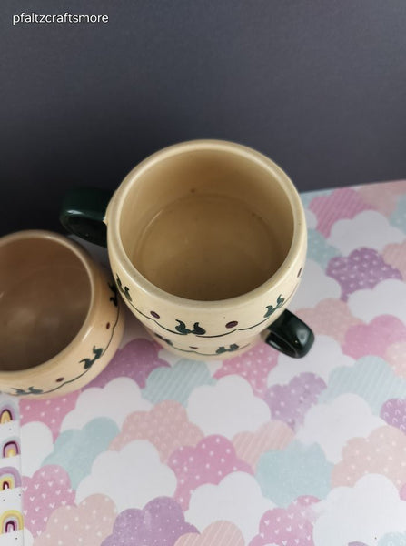Includes 5 (five) cups, as pictured. Measures approx. 3" diameter at top, 2.25" tall. Nice & clean, only the most minute of light silverware scuffing (surface only) can be seen in direct light. Smooth to touch. Design in perfect shape. No chips or cracks, no stains.