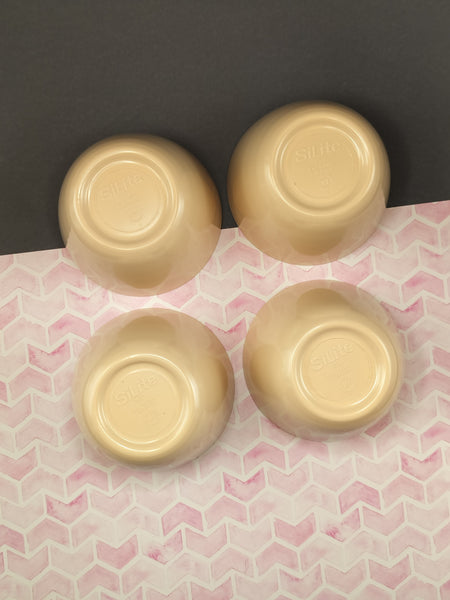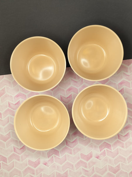 Includes 4 (four) 8 oz fruit bowls, as pictured. Each measures approx. 3.75" diameter at top. Bowls show minimal extremely fine surface scuffing from use once or twice, surface is smooth to the touch. No chips or cracks, no stains.