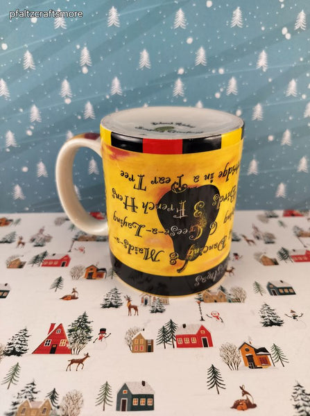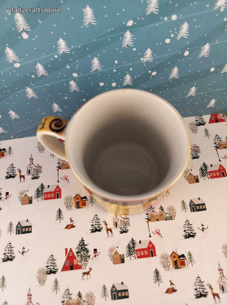 Includes 1 (one) mug, as pictured. Measures approx. 3.75" tall, like new. No chips, cracks, scratches, or stains. Minimal wear around outside bottom (underside) from storage.