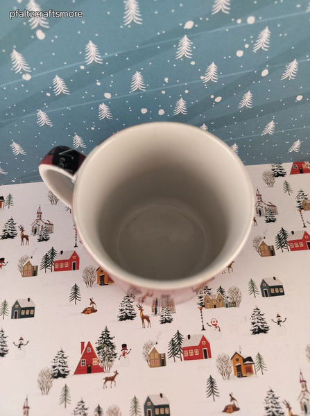 Includes 1 (one) mug, as pictured. Measures approx. 3.75" tall, like new. No chips, cracks, scratches, or stains. Minimal wear around outside bottom (underside) from storage.