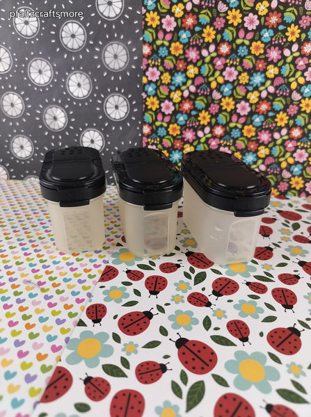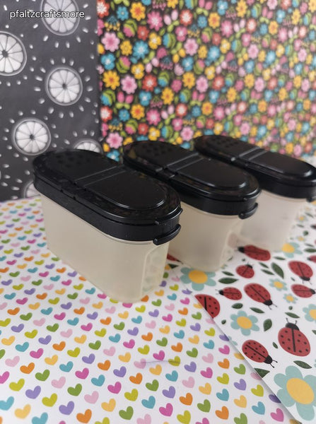Nice & clean, includes 3 (three) shakers, as pictured. Each measures approx. 2.25" H, 1.5" x 3.25". Lids fit securely.