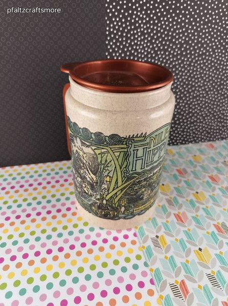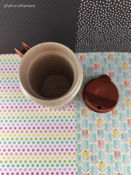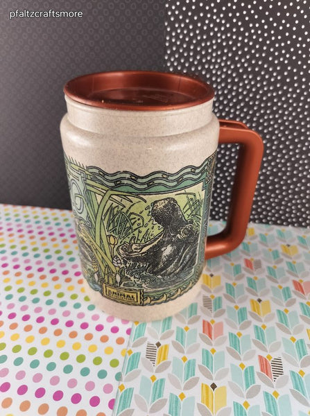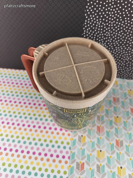 Nice & clean, travel mug measures approx. 5.5" tall. No stains; no chips, or cracks, minimal scratching to design.